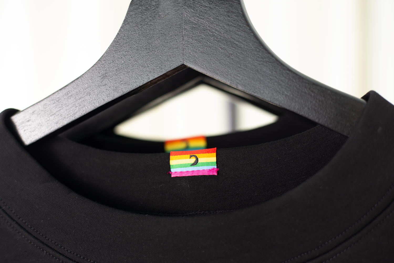 Étiquette tissée aux couleurs LGBTQ+, délicatement cousue sur le rebord du capuchon.